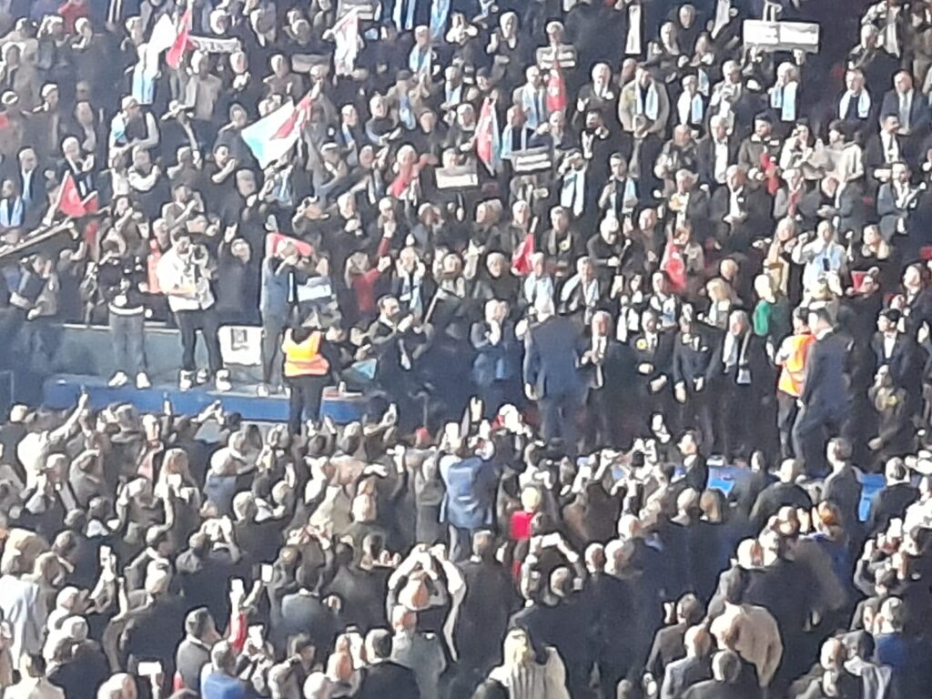 Coşkulu kalabalığa karanfil dağıtarak hazırlanan araç üzerinden seslenen Dervişoğlu daha sonra konuşmasına Atatürk kapalı spor salonu içinde devam etti.