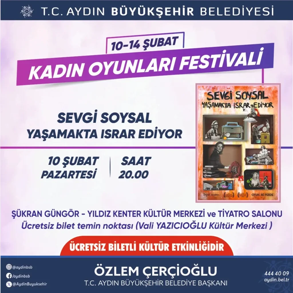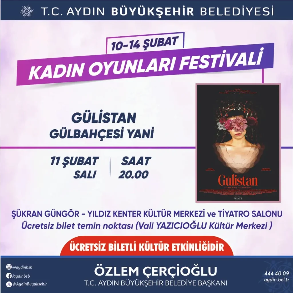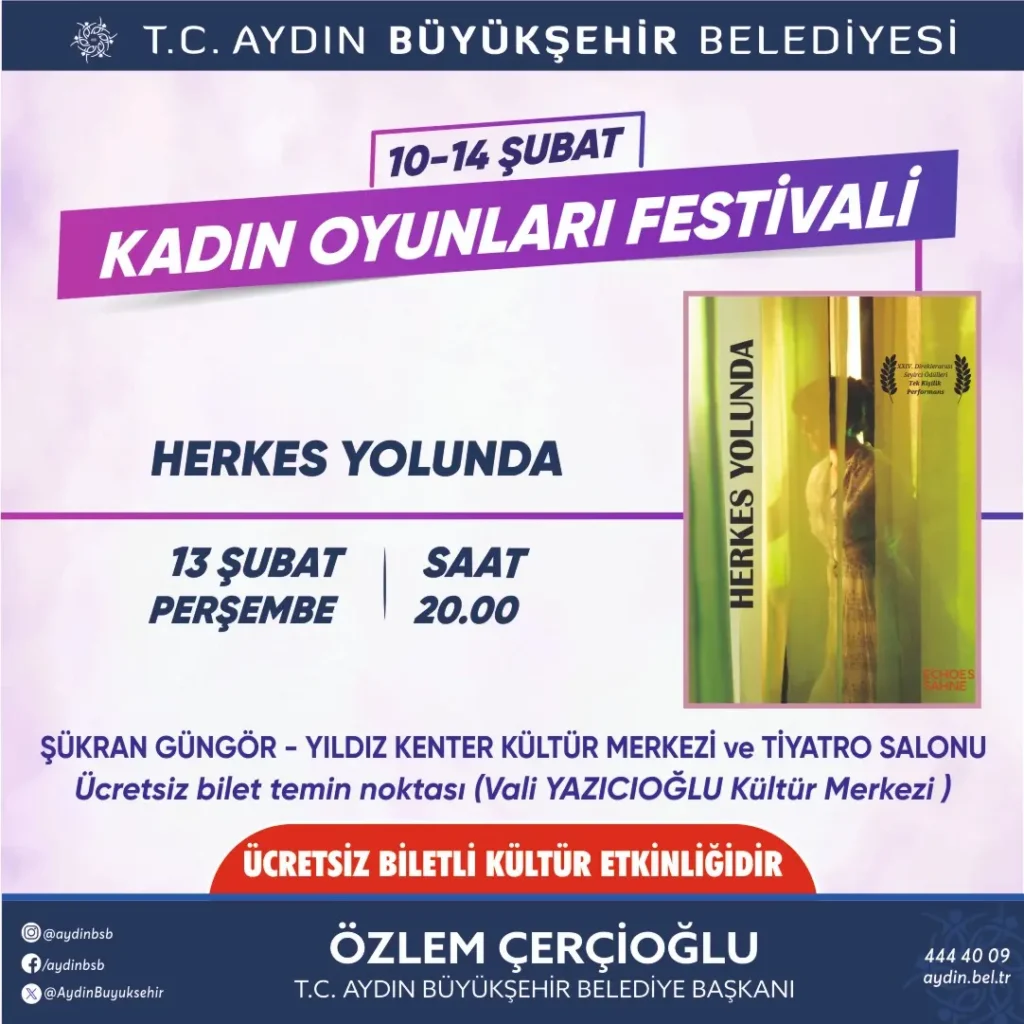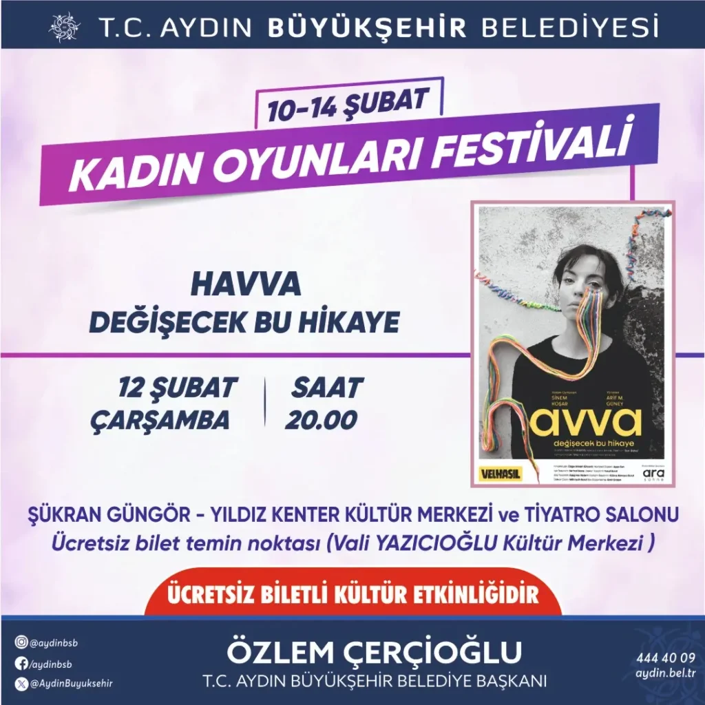 Büyükşehir Belediyesi, Türkiye’nin ve Avrupa’nın tek kadın temalı tiyatro festivali olan ‘Kadın Oyunları Festivali’ne ev sahipliği yapmaya hazırlanıyor. Bugüne kadar her yaştan binlerce tiyatroseveri birbirinden güzel eserler ile buluşturan Büyükşehir Belediyesi Şehir Tiyatroları, 10-14 Şubat tarihleri arasında 5 farklı oyun ile perdelerini açacak. Kadın Oyunları Festivali’nde Aydınlılar ile buluşacak eserler için ücretsiz biletler Vali Yazıcıoğlu Kültür Merkezi’nden temin edilebilecek.