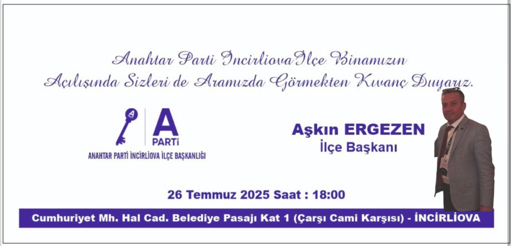 Siyasetin renkli simalarından Aşkın Ergezen’in İlçe Başkanlığını yaptığı A Parti son aylarda İncirliova’da gözle görülen bir sıçrama gerçekleştirmektedir. Son dönemin popüler ismi Anahtar Parti İlçe Başkanı Ergezen ‘’ Çok kıymetli hemşehrilerimiz, 26 Temmuz 2025 Cumartesi günü saat 18.00’de erçekleştirilecek olan Anahtar Parti İncirliova İlçe Başkanlığı açılış programımıza siz değerli vatandaşlarımızı davet etmekten onur duyarız. Gelin, bu anlamlı günde birlik olalım, geleceğimizi birlikte inşa edelim’’ sözleriyle tüm vatandaşları açılışa beklediklerini ifade etti.
