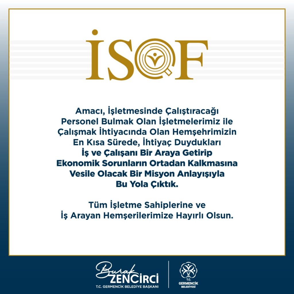 Germencik Belediye Başkanı Burak Zencirci ilçe ekonomisine ve istihdama yönelik önemli katkıda bulunacak olan projesini hayata geçirdi. Germencik Belediyesi İstihdam Ofisi Germencik Belediyesi bünyesinde faaliyetlerine başladı. Seçim döneminde vaatleri arasında yer alan ve bölgedeki iş verenler ile iş arayanları buluşturacak bir platformun sözünü veren Başkan Zencirci Germencik Belediyesi İstihdam Ofisi kısa adıyla İSOF’u duyurdu. İSOF, bölge veya bölge dışında bulunan işletme ve firmaların personel ihtiyacına yönelik iş arayan vatandaşları yönlendirecek. İş arayan vatandaşlar İSOF’un sosyal medya hesapları üzerinden veya belediyenin dahili hattından bilgi alabilecek ve isof@germencik.bel.tr e-posta adresine istedikleri poziyonları belirttikleri CV’lerini göndererek başvuru yapabileceklerdir.