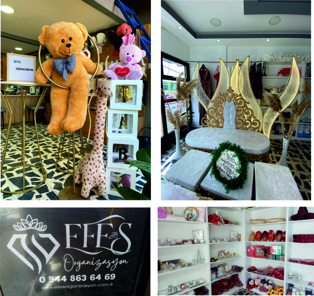 Efes Organizasyon sizlere başta düğün olmak üzere nişan, kına gecesi, sünnet, doğum günü ve tüm davet organizasyonlarınız için süsleme hizmetleri veren; sektöründe Aydın’ın önde gelen firmaları arasında yer almak için iddialı giriş yapan, bir düğün ve davet organizasyonu firmasıdır. Düğün süslemeleri, düğün malzemeleri, çeşitli düğün ekipleri gibi ihtiyaçlarınız için hizmetinizdeyiz. Ayrıca Efes Organizasyon bünyesinde dans kursu da mevcuttur.