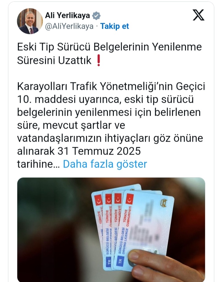 İçişleri Bakanı Ali Yerlikaya “Eski tip sürücü belgelerinin yenilenme süresini uzattık” dedi. Yerlikaya “Mevcut şartlar ve vatandaşlarımızın ihtiyaçları göz önüne alınarak 31 Temmuz 2025 tarihine kadar uzatıldı” ifadesini kullandı.