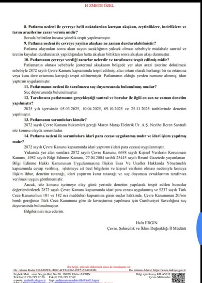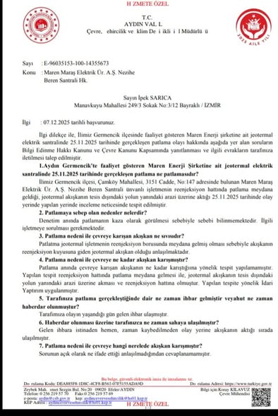 Aydın’ın Germencik ilçesinde geçtiğimiz günlerde yaşanan jeotermal patlamanın ardından, Çevre, Şehircilik ve İklim Değişikliği İl Müdürlüğü’ne yazılı olarak yöneltilen sorulara verilen cevaplar tepkilere neden oldu. Germencik Çevre ve Doğa Derneği Başkanı Halil Çetinkaya, kurum tarafından verilen yanıtların “sorumsuzca, basit, içi boş ve yetersiz” olduğunu belirterek sert eleştirilerde bulundu.