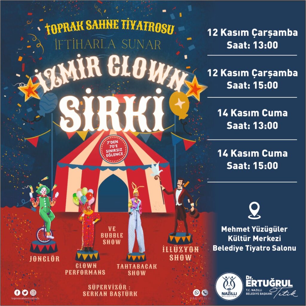 Nazilli Belediyesi, ara tatilde çocuklara unutulmaz bir etkinlik armağan ediyor. Toprak Sahne Tiyatrosu tarafından sahnelenen “İzmir Clown Sirki” gösterisi, birbirinden renkli performanslarıyla çocuklara neşeli dakikalar yaşatacak.