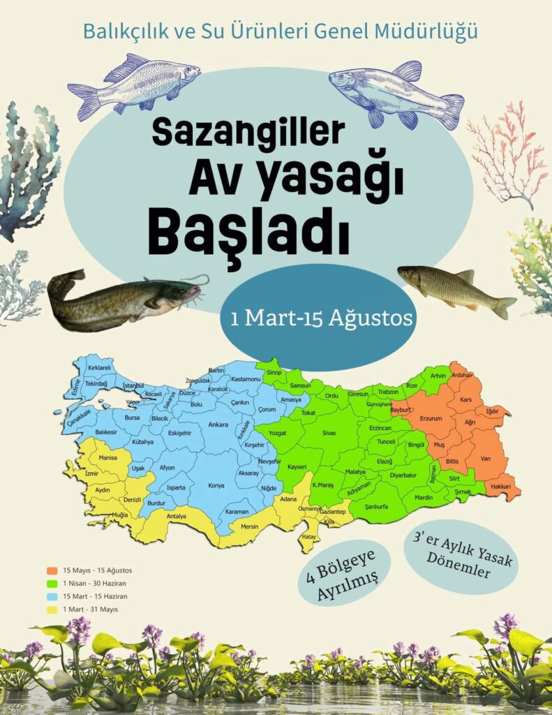 Tarım ve Orman Bakanlığı Balıkçılık ve Su Ürünleri Genel Müdürlüğü, balık popülasyonunun korunması ve sürdürülebilir balıkçılığın sağlanması amacıyla iç sularda sazangillere yönelik av yasağının 1 Mart 2025 tarihi itibariyle başladığını duyurdu. Balık avı yasağının Aydın ilinde 31 Mayıs ve Ülke genelinde ise15 Ağustos tarihinde sona ereceği ve belirtilen tarihte yeniden açılacağı bildirildi.