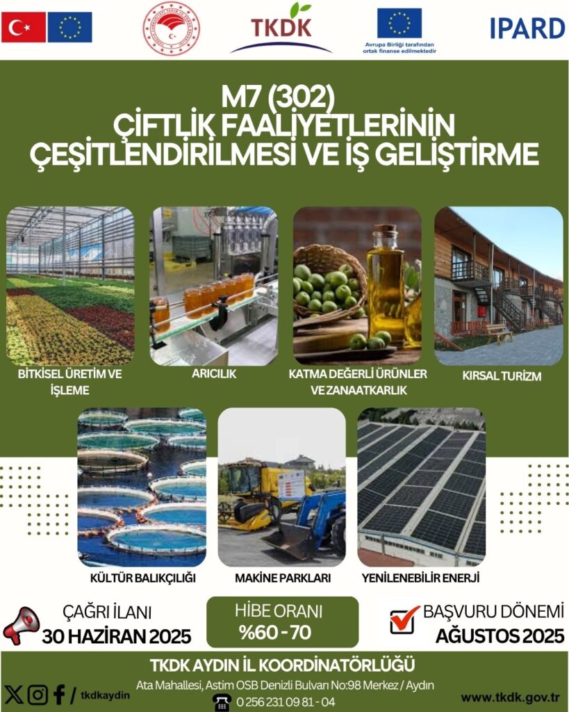 TKDK’nın yedinci proje başvuru çağrısı, çiftlik faaliyetlerinin çeşitlendirilmesi ve iş geliştirme başlıklarında yoğunlaşıyor. Bu kapsamda; sera ve kapalı alanlarda bitkisel üretim, tıbbi ve aromatik bitkiler, mantar üretimi, solucan gübresi, arı ürünlerinin işlenmesi ve paketlenmesi, zanaatkârlık ve katma değerli ürünlerin üretimi, kırsal turizm, su ürünleri yetiştiriciliği ve yenilenebilir enerji yatırımları desteklenecek.