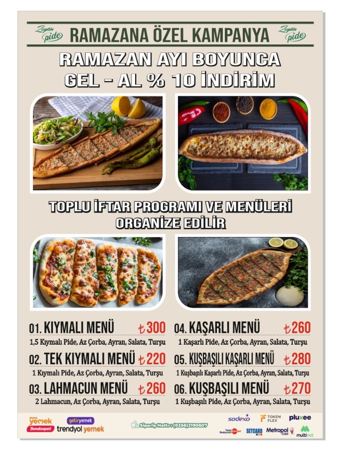 Zeytin Pide de ramazan ayına özel kampanya dudak uçuklatacak. Ramazan ayı boyunca Zeytin pideye uğrayıp pide yiyenlere %10 indirim yapılacaktır. Zeytin pide de 6 çeşit menü ramazan ayına özel hazırlanmıştır olup bu özel menülere özel fiyatlar uygulanacaktır.